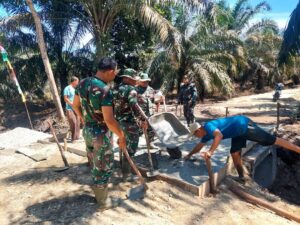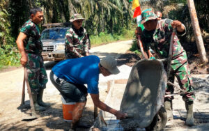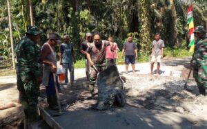 Kegiatan ini melibatkan personel TNI bersama masyarakat setempat yang bahu-membahu melaksanakan pengecoran sebagai bagian dari pembangunan infrastruktur pendukung akses jalan.