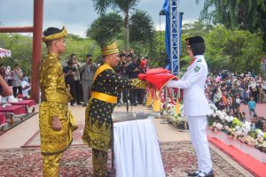 Usai menurunkan Sang Merah Putih oleh Paskibraka Kabupaten Bengkalis, Zahwa Ramadhanesyha, asal SMAS IT Mutiara Kecamatan Mandau, yang bertugas sebagai pembawa baki, menyerahkan langsung kepada Inspektur Upacara, Wakil Bupati Bengkalis H Bagus Santoso.
