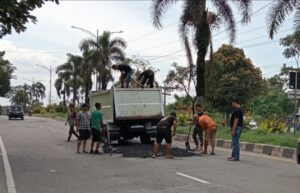 DUMAI, TEMPORIAU.co – Jalan Soekarno-Hatta Kota Dumai yang mengalami kerusakan akibat kondisi permukaan lapisan aspal lama terkelupas atau berlubang kembali diperbaiki.