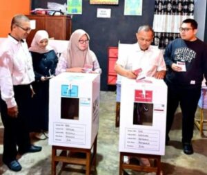 Selanjutnya, Bagus Santoso dan Hj Siti Aisyah memasuki bilik yang berbeda untuk mencoblos pilihan masing-masing.