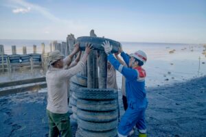 Perwira PT KPI Kilang Dumai bersama masyarakat Kelurahan Mundam membangun Alat Pemecah Ombak (APO) Lancang Kuning dari Program TJSL Bedelau Minapolitan