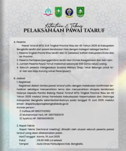 Pelaksanaan Pawai ta’aruf Musabaqoh Tilawatil Qur’an (MTQ) ke-43 tingkat Provinsi Riau tahun 2025, akan digelar pada Sabtu 28 Juni 2025 pagi, pukul 08.00 WIB. Start dari Wisma Bupati dan finish di Lapangan Tugu Bengkalis.