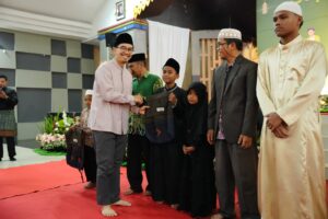General Manager PT KPI Kilang Dumai, Iwan Kurniawan serahkan tas sekolah untuk anak-anak yatim dalam Safari Ramadan di Gedung BPSM Komperta Bukit Datuk, Kamis (20/3)