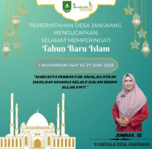 TEMPORIAU.co Bantan, – Pejabat Kepala Desa Jangkang Kecamatan Bantan Kabupaten Bengkalis, Ibuk Juminah,.SE mengucapkan selamat Tahun Baru Islam 2025 atau 1 Muharram 1447 Hijriah menjadi momen istimewa bagi Muslim di seluruh Dunia. Ini bukan sekadar pergantian Tahun, melainkan saat untuk merenung, memperbaiki diri, dan memperbarui niat dalam menjalani hidup sesuai ajaran Islam.,ucap nya.