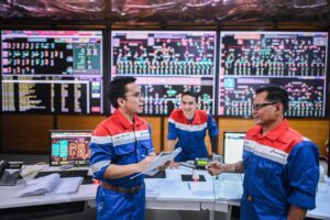 Sejumlah pekerja Tengah berdiskusi dalam ruangan Decission Support Center (DSC) di WK Rokan