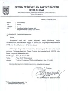 Surat Pimpinan DPRD Kota Dumai yang disampaikan ke PT OSM 14 Januari 2025, Komisi II DPRD Dumai bermaksud melakukan koordinasi terkait perizinan PT Olekimia Sejahtera Mas sebagai tindak lanjut audiensi 14 Januari 2025 diminta kepada OSM untuk dapat menerima peninjauan lapangan yang dijadwalkan 18 Januari 2025.