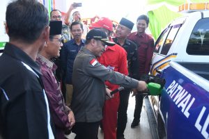 Wabup Bagus Santoso didampingi Owner SPBU melanjutkan acara dengan memotong tali pita dan pengisian BBM perdana sebagai simbolis atau tanda resminya SPBU NO. 16 -287 – 092 Tanjung Kapal.
