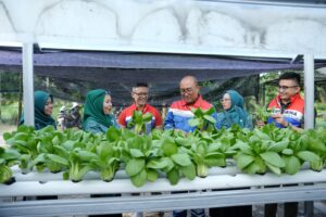 VP CSR & SMEPP Management PT Pertamina (Persero), Rudi Ariffianto bersama rombongan saat meninjau kebun hidroponik Pos Kesehatan Kelurahan (Poskeskel) Mundam—Program TJSL PT KPI Kilang Dumai pada Selasa (29/4).